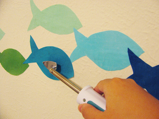 First, I designed the whole layout on Adobe Illustrator. I measured the wall and then enlarged my design in correspondence to my wall measurement. After that, I printed the enlarged illustration. I only needed to print several shapes, which were the fish (small, medium, and big size), the ship (3 components), and the cloud (big and small). Then, I cut out all the shapes and I made them as the tracing guide.